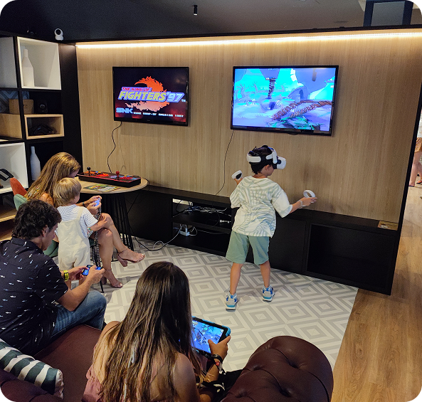 Nintendo Switch, PS5, arcade y consolas retro reunidas en una zona de juego con pantallas y sonido envolvente.